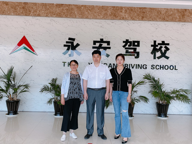 [上圖為財稅部李霞娟經(jīng)理(左)、會計杜思惠(右)與走訪對象——永安駕??偨?jīng)理許美良(中)合影。]